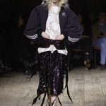 Essa ideia se traduz nas padronagens florais e jacquards de aparência clássica, recortados e remontados em novas proporções. Ela também está nos tweeds em preto e branco desfiados, com leveza de pluma, e nos bordados coloridos que lembram colagens têxteis. Em muitos looks, diferentes tecidos compõem uma mesma peça, entre eles tafetá, tule, brocados e rendas.
