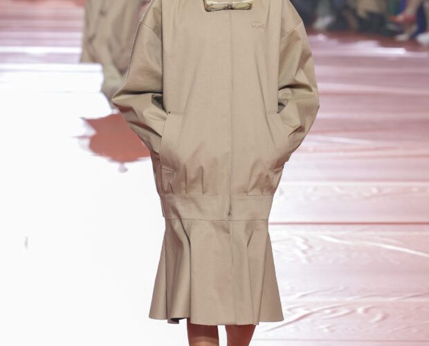 O mote climático também serviu de ensejo para a primeira parceria de Pelagia na Lacoste. No caso, com a marca de outerwear britânica Mackintosh. A label é conhecida desde o século 19 por produzir tecidos e produtos pensados para as condições meteorológicas adversas do Reino Unido. Aqui, a collab dá origem a uma série de trench coats, ponchos com modelagens baseadas em camisas polo, saias amplas e versões híbridas, como uma jaqueta-vestido com cintura baixa e saia plissada.